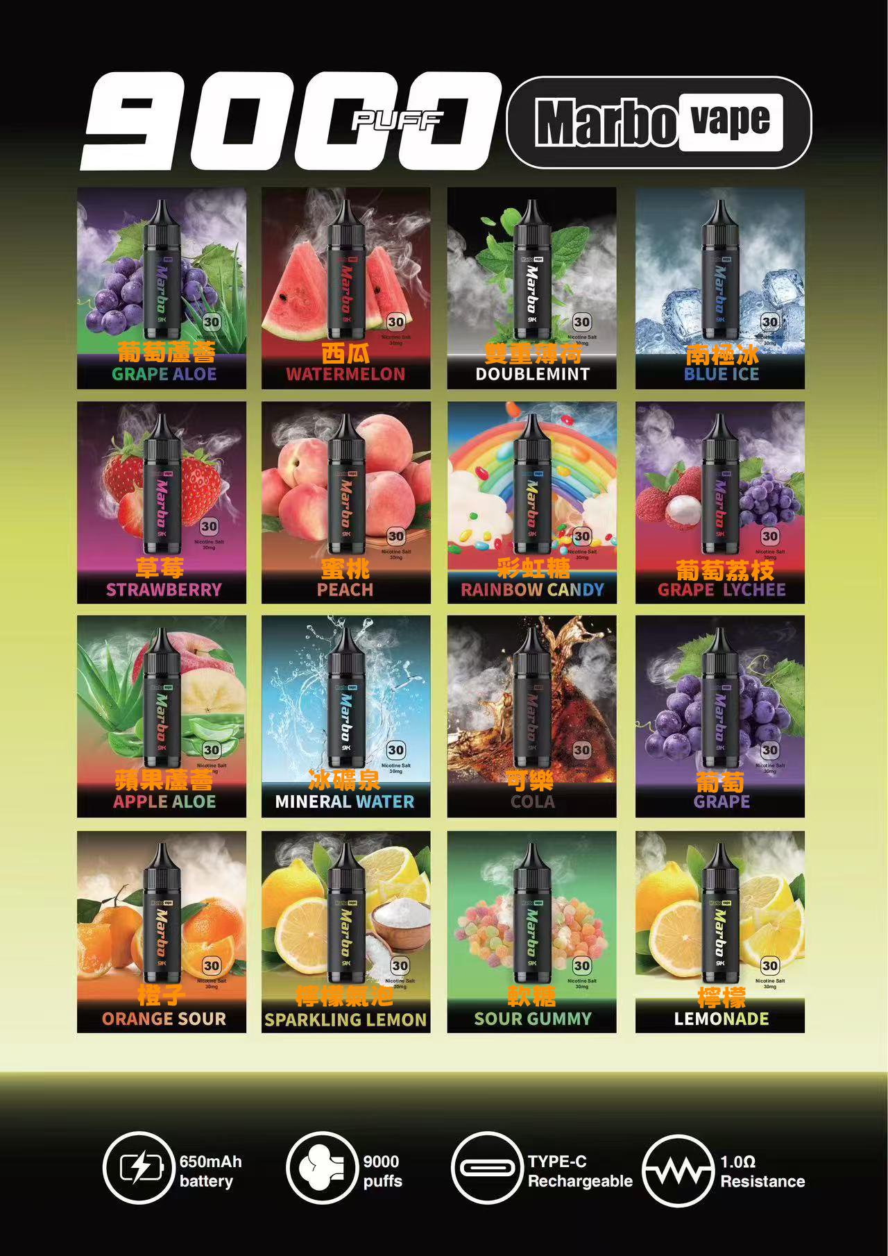 來自泰國知名品牌 MARBO BAR 9000 Puffs一次性電子煙,13款口味選擇,14ml容量,提供 3%(30mg)尼古丁強度選擇,配備 600mAh 的大容量電池,確保長效使用。採用 1.0Ω 的網狀線圈技術,提升煙霧量和風味表現。